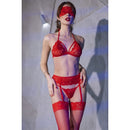 Magnífico conjunto vermelho, composto por sutiã com alça de pescoço e copas triangulares, bela tanga, venda tentadora, magnífico cinto de ligas e fantásticas meias de ligas de renda. As alças ajustáveis do pescoço e das costas do sutiã, juntamente com o cinto de ligas ajustável, garantem um ajuste perfeito.