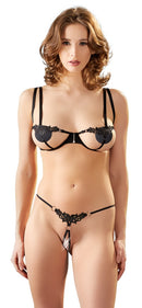 O sutiã com as copas abertas consiste apenas de fios e fitas e, portanto, tem uma aparência profunda. Somente seus mamilos são cobertos com bordados de alta qualidade ... Um pequeno acessório de strass entre os copas também atrai a atenção de todos. O sutiã possui um prendedor de gancho nas costas e as tiras são ajustáveis em comprimento.